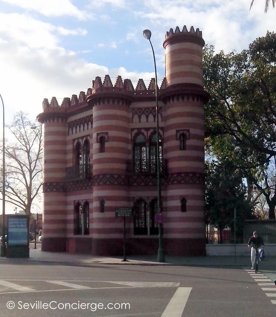 Pretty much everybody who comes to Seville has the Plaza España in Maria Luisa Park on their list of places to see, and rightly so. But here’s a suggestion for something a little different to look at on your way back to the city. Just outside the park proper, across the main road from the Los Remedios Bridge, is an almost fairytale little building decorated with horizontal stripes that always remind me of a wedding cake, and topped with crenellations and a miniature watchtower. It’s popularly known, for historically inaccurate reasons, as the “Queens Sewing Box”, and for this reason has become attached to a rather poignant story.
