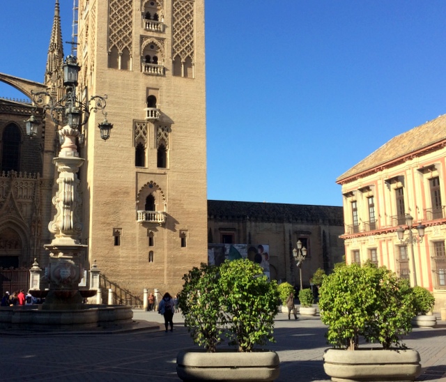 1248, and the Christian conquerors led by Ferdinand III entered the city. At first there was probably little outward change in appearances. The mosque was reconsecrated as a cathedral, and some houses on the north side of the square were given to the new Archbishop as a residence. Over the next 500 years these would gradually be transformed into the grand Palace we see today, with the impressive entranceway, the last part to be built, being added in the 18th century. In fact, until this time, the square as an open space did not exist, being occupied by a number of buildings belonging to the church and used for administration. The enclosure around these buildings was known as the Corral de Los Olmos, the Courtyard of the Elms, after the Virgin of the Elms who can still be seen in a little niche on the side of the Giralda Tower. This is the name by which Cervantes referred to it, as can be seen by the plaque on the wall behind the statue of the Pope.